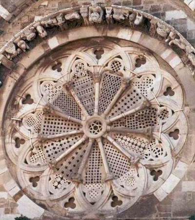 Non esistono altri rosoni gotici (o romanici) basati su un tale numero, che pure è composto da due "numeri sacri" (7 x2). La tipologia più comune dei rosoni prevedeva la ripartizione geometrica in dodici, sedici o ventiquattro spicchi, con precisi significati simbolici. In particolare il numero otto, con i suoi multipli 16 e 24, rappresentava la totalità dell'Universo, era un numero solare che rendeva equivalente il poligono alla circonferenza. Un solo rosone è conosciuto con undici spicchi, quello romanico della Cattedrale di Troja (FG), realizzato intorno al 1200.