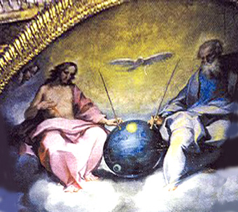 Gli oggetti che più d´ogni altro hanno fatto pensare al satellite, e ciò le "antenne", sarebbero quindi scettri, saldamente tenuti in mano da Gesù e da Dio. Questi scettri scendono dalle loro mani e si saldano sul globo a simboleggiare il contatto e l´unione con il Creato.