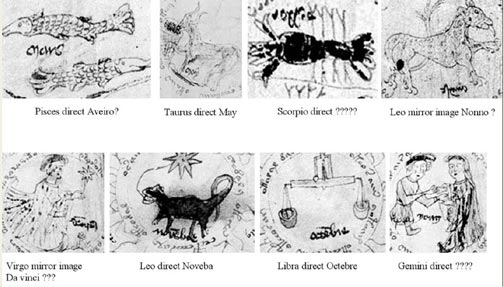 • Questo non è il solo disegno del manoscritto che riveli l'uso di immagine speculari per scrivere o disegnare. Ci sono un certo numero di altre carte astrologiche che rappresentano gli altri segni dello zodiaco. Ho ritagliato alcune delle immagini e messo il segno e il nome sotto di esse, insieme con la mia interpretazione del nome. La scrittura di alcuni dei nomi è diversa e non tutti i nomi sono scritti specularmente. Poiché non si sa nulla circa l'infanzia di Leonardo, è difficile per me mettere queste immagini in relazione con i suoi primi anni di vita. Il disegno dei Gemelli è interessante, in quanto raffigura un uomo e una donna vestiti in abiti tipici del XV secolo in Italia. Nel disegno astronomico della Via Lattea, le stelle si muovono attraverso il cielo notturno in senso orario. Come le stelle nel cielo sorgono in Oriente e in Occidente insieme, viaggiando in senso antiorario, questo disegno è l'immagine speculare di ciò che avviene realmente.(8)
