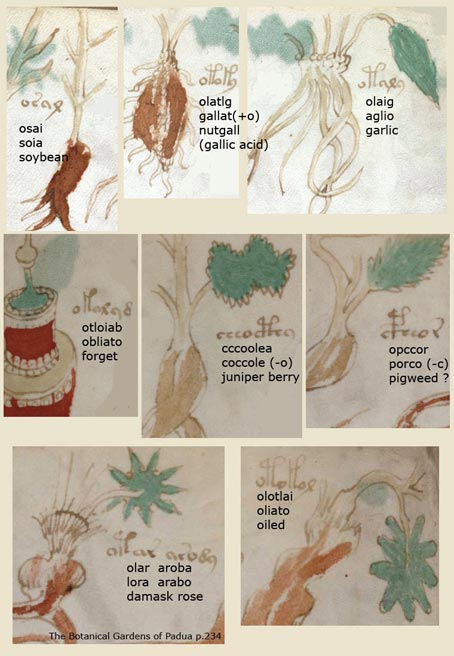 Ho utilizzato un sito Internet, ´Italian Anagram Dictionary', per aiutarmi a decodificare le parole e tradurre gli anagrammi in inglese. Il libro 'Orto Botanico di Padova 1545-1995'(4) ha contribuito a individuare alcuni dei nomi comunemente utilizzati per gli impianti in Italia, nel secolo XVI. Potete giudicare dagli esempi qui di seguito, se questo codice di anagrammi è riuscito a decifrare questa selezione limitata dal manoscritto Voynich. Spero che qualcuno di voi che legge la scrittura medievale italiana aiuterà a decifrare più del manoscritto, in modo che possiamo dipanare finalmente i misteri, se del caso, che questo manoscritto nasconde.