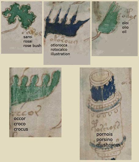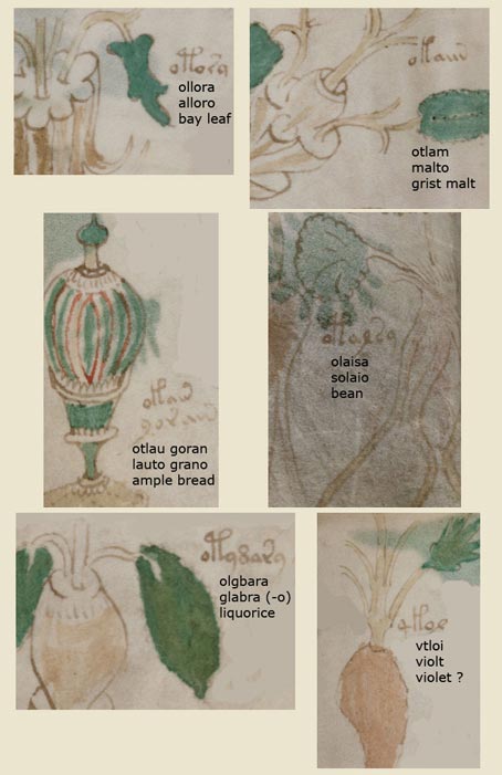Tramite l'utilizzo di questo alfabeto di base, ho individuato una serie di piante, erbe e verdure dalle pagine sulle erbe. Non ero in grado di decifrare tutte le parole, senza dubbio a causa del fatto che molti nomi di piante di circa 500 e più anni fa, probabilmente, sono nel frattempo caduti in disuso. In aggiunta la modifica nella grafia di alcune parole può avere reso difficile per una come me, che non legge o parla italiano, decifrare queste parole.