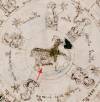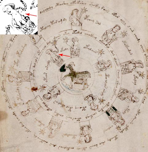 Un disegno che rappresenta il segno zodiacale dell'Ariete, con quindici donne nude sedute in vasche, aveva attirato la mia attenzione. Un cugino antiquario mi disse che le vasche probabilmente rappresentavano vasche per il parto, che erano in uso nel Medioevo, per aiutare la nascita di un bambino. La maggior parte delle donne raffigurate appaiono in stato di gravidanza. Da un esame più approfondito del disegno è emerso che questo suggerimento delle vasche da parto è probabilmente corretto. Un bambino appare nella vasca indicato da una freccia (ingrandita nell'angolo in alto a sinistra della figura 1) e la signora non appare più in stato di gravidanza. Questa vasca si distingue anche perché la signora è in possesso di un stringa a righe con la stella sulla punta, mentre tutte le altre signore tengono stringhe lisce. Per inciso, se si digita "vasca da parto" in un motore di ricerca su internet si trova una serie di pubblicità, perché le vasche da parto stanno ancora una volta diventando sempre più popolari.