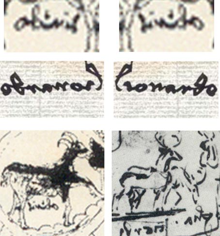 La figura mostra un confronto di questa firma, diritta e speculare, con la firma autografa di Leonardo da Vinci, anche diritta e speculare. (5) La somiglianza è evidente, ma un esperto di scrittura sarebbe tenuto a confermare questo. Inoltre ci sarebbe stato il passaggio di un certo numero di anni tra le due firme, che si vede nel cambiamento di certe lettere. La firma è stata scritta in modo speculare per iscritto, mentre l'altra non lo era. Vi mostro anche un disegno di un cervo preso da uno dei puzzle di immagini di Leonardo. C'è una somiglianza tra il disegno e l'Ariete nel grafico natale.