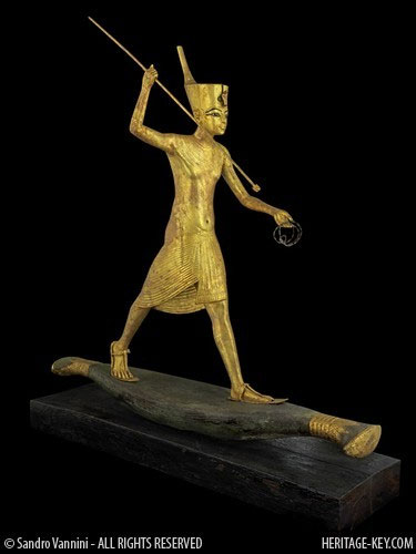 Qui il giovane faraone cavalca una zattera di papiri. In una mano tiene una lancia per cacciare un invisibile ippopotamo – simbolo del disordine -; nell´altra c´è invece una corda arrotolata per catturare l´animale sconfitto.