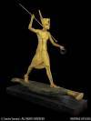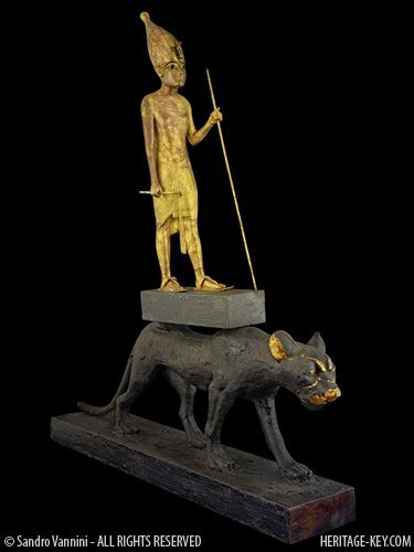 Nella statuetta, Tutankhamon porta un´alta corona e tiene nelle mani un bastone e un correggiato. E, dominando una pantera, simbolo degli inferi, riesce a superare i pericoli dell´aldilà e a rinascere la mattina seguente.