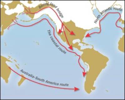 Tali scoperte sollevano interrogativi intriganti. Si ritiene che i gruppi di Clovis abbiano attraversato un ampio ponte di terra attraverso lo Stretto di Bering, facendosi strada tra spaccature nei ghiacciai. Ma se la gente visse sul continente anche solo 2, 000 anni prima, sarebbero arrivati in un momento in cui i ghiacciai erano invalicabili. Ciò ha portato a discutere una rotta marina lungo un ponte di terra e quindi lungo la linea di costa occidentale. Altri suggeriscono che potrebbero essere giunti dall´Australia o dalla penisola iberica.