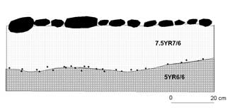 Il profilo (fig 3a) dall´alto in basso è come segue: sotto il terreno del deserto con molti ciottoli, si trova uno strato di 20-30 cm di sabbia fine rossa-giallastra. La sabbia è ben consolidata. Il deposito contiene reperti molto freschi privi di patina (fig 3b) principalmente alla base, ma anche sparsi nella sabbia. Alcuni reperti sono in posizione orizzontale mentre altri sono posti verticalmente. La sabbia contenente i manufatti ha mantenuto un colore rosso giallastro in qualche modo più intenso, sabbia di quarzo granulare, con una copertura di ciottoli.