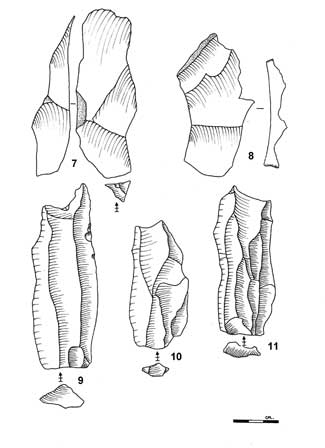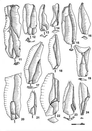 Le lame sono state ottenute da una continua riduzione senza dover rimodellare la forma del sedimento. Misurano da 10 a 20 cm di lunghezza, generalmente da 2 a 4 di ampiezza, spesso con una sezione incrociata trapezoidale, e sono per lo più spesse da 1 a 2 cm. Il fondo è generalmente piatto, talvolta sfaccettato. La tecnologia di Levallois manca eccetto per un singolo tipo di reperto di quarzo nubiano dalla superficie. Alcune schegge mostrano reminescenze di provenienza nubiana o perfino più classiche di Levallois. Non sono stati trovati utensili, eccetto un frammento di sfogliato non patinato a due facce. Sono assenti ritocchi fini e regolari per addolcire gli spigoli.