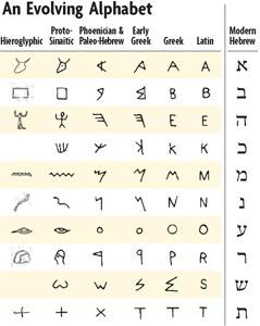 L'Aleph ebraico moderno lettera è la 'alpeggio, la parola "bue", la scommessa lettera è la Bayt o "casa"; ayin la lettera', "l'occhio", è il nome della vecchia lettera pittorica in proto-cananeo script (vedi disegni verso la fine di questo articolo). Ma guardando un aleph ebraico moderno, puntare o 'ayin, non possiamo più vedere il bue, la casa o l'occhio (e non sono questi pittogrammi originali evidente nelle lettere latine A o B).