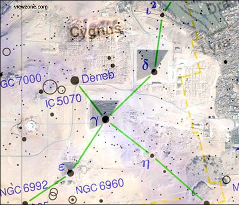 Collins ha scoperto un altro gruppo di stelle nella costellazione del Cigno, che ha trovato corrispondere con la stessa perfezione che era il marchio di fabbrica degli Egizi. Sovrapponendo le stelle del Cigno alle tre piramidi poteva vedere che una stella, Deneb, non era allineata. Ci doveva essere qualcosa - una piramide o tempio - ma non c'era niente. Forse il tempo l'ha distrutto? Forse è stato sepolto? O forse era un segno che qualcosa era sotto l'altopiano, in attesa d'essere scoperto.