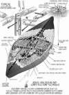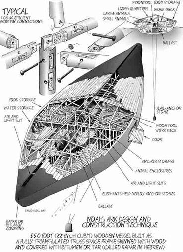 Quando l'acqua scende, l'Arca oscilla lateralmente ed è depositata, appoggiata ad una piccola scarpata di circa dieci metri, come indicato in figura, richiedendo solo una piccola opera manuale. Per una veduta in prospettiva di come l'arca doveva essere, si veda il disegno che segue. Questo disegno si basa su un'analisi dei reperti attribuiti all'Arca, presso Üzengili, sul monte Judi. La tecnica di costruzione a "scomparti" sezionati è l'unico modo in cui una nave di legno di grandi dimensioni come questa può essere costruita, allora come adesso. Chiaramente, una certa licenza è stata presa per quanto riguarda i dettagli degli interni, ma la logica è stata applicata. Per esempio, non siamo sicuri che gli elefanti fossero utilizzati per spostare l'enorme ancora di pietra, dal peso di diverse tonnellate, ma con una piccola ciurma, la domanda ovvia è: perché non avrebbero dovuto utilizzare una forza motrice così preziosa? Più in alto lungo i pendii del monte Judi, diciassette miglia a sud, in vista del monte Ararat, e proprio sotto la grande scarpata di calcare bianco conosciuta come Ziyaret, che significa "santuario", si trovano le rovine e i resti dell'antica città perduta di Noè, chiamato "Mesha" anticamente, e nota in seguito come "Naxuan".