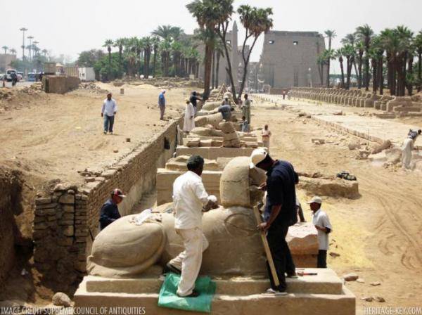 Si pensa che il viale delle sfingi, lungo 2.7 chilometri e largo fino a 76 metri, ospitasse non meno di 1350 sfingi. Venne inzialmente costruito dal faraone Amenhotep III (1410-1372 a.C.) e poi ricostruito dal faraone della 30′ dinastia Nectanebo I (380-362 a.C.), che sostituì le precedenti teste di ariete delle sfingi con la propria.Recentemente sulla via erano state trovate fondamenta di pietra - alcune delle quali decorate con raffigurazioni del faraone Amenhotep III - usate per installare le statue delle sfingi, una "cappella" del sacerdote Min-Kheber-Re della 21′ dinastia e una serie di sfingi che, una volta restaurate, verranno riposizionate sul viale.
