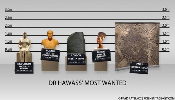 Alla fine della conferenza, il padrone di casa presentò un elenco di richieste che includeva sei capolavori: il busto del "visir" Ankhaf dal Museum of Fine Arts di Boston; la Stele di Rosetta dal British Museum; il bassorilievo astrologico raffigurante uno zodiaco dal Louvre; il busto di Nefertiti dal Neues Museum di Berlino; la statua di Hemiunu dal museo di Hildesheim e la scultura di Ramses II (o Ramesse II) dal Museo egizio di Torino.La missione di Hawass di riportare in Egitto queste opere d'arte è però tutt'altro che facile. L'MFA di Boston è "irritato", mentre il Louvre e il Museo egizio di Torino rifiutano di cedere. Lo scorso dicembre il Neues Museum ha mandato un suo rappresentante in Egitto con la documentazione di vecchi contratti. Indicano che "tutto venne fatto legalmente" quando il busto di Nefertiti venne trovato e venduto nel 1913.