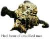 Le gambe erano state premute insieme, legate e torte affinché i polpacci fossero paralleli al patibolo. I piedi erano stati assicurati alla croce tramite un chiodo di ferro spinto attraverso entrambe i talloni (tuber calanei). Il chiodo di ferro conteneva, oltre la sua testa rotonda, i seguenti sedimenti: frammenti di legno (Pistacia o Acacia), una crosta vischiosa, una porzione dell´osso del tallone destro, un piccolo pezzo dell´osso del calcagno destro, un frammento di legno di olivo.