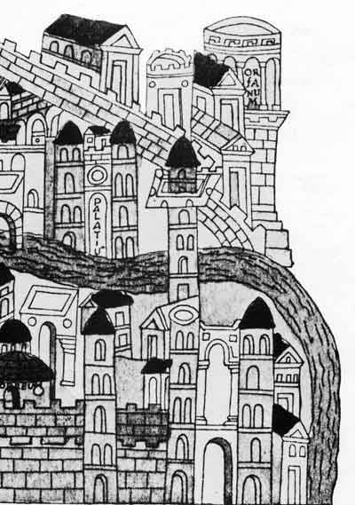 Guardando in alto, questa antica pianta cittadina del Codice CXIV-106, conservata presso la Biblioteca Capitolare di Verona, sulla destra, tra le costruzioni, osserviamo un enorme edificio a forma di Torre che sporge dietro i fabbricati, al di fuori delle mura cittadine, ai piedi della collina e lambito dall'Adige: L'Organum.