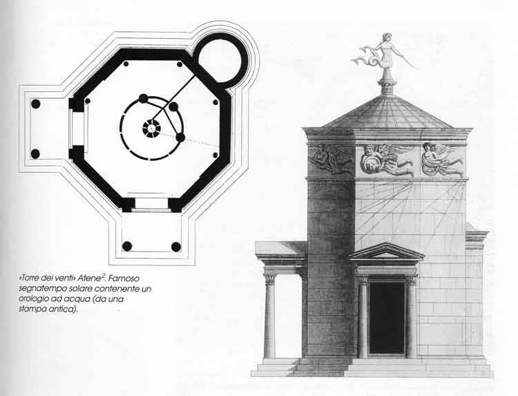 - 2 Atene: Torre dei Venti, ottagonale, situata nell'Agorà, molto rovinata alta circa 14 metri. Su ogni lato solare vi è una meridiana. Il suo orientamento sui punti cardinali è esatto, A levante, a meridione e ponente in alto sulla Torre vi sono dei pertugi-finestre per regolare la clessidra interna (oggi scomparsa) sulla posizione del sole (orario), Dietro vi alloggia una cisterna di alimentazione d'acqua fornita da una sorgente, un rio invece serve al deflusso,