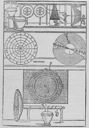 - 11 Due sono i reperti d'orologi idraulici romani trovati in Europa centrale a cavallo del secolo. Indicativamente vicino a Digione: Vosges - e vicino a Monaco: Salzbourg -. Sono degli interessanti dischi di bronzo (quadranti) lavorati ed incisi per l'informazione giornaliera del movimento del Sole e tarati sulle stagioni. ("Orologi Francesi" l° voI. Tardy Parigi. 1974).