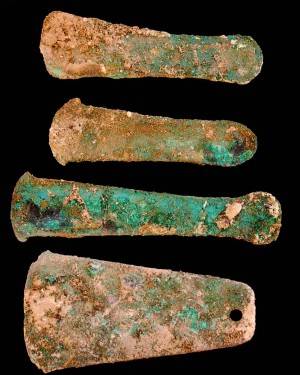 Ma sono proprio le asce a spiccare per la loro eccezionalità, a cominciare dal materiale con cui sono forgiate e cioè rame arsenicale, come confermano ora le analisi chimico-fisiche compiute in fase di restauro, che proviene senz'altro dalle miniere poste a sud del Mar Morto nello Wadi Feinan: in queste miniere infatti sono state ritrovati anche gli stampi per realizzare asce, proprio di uno dei tipi attestati nel magazzino di Batrawy.
