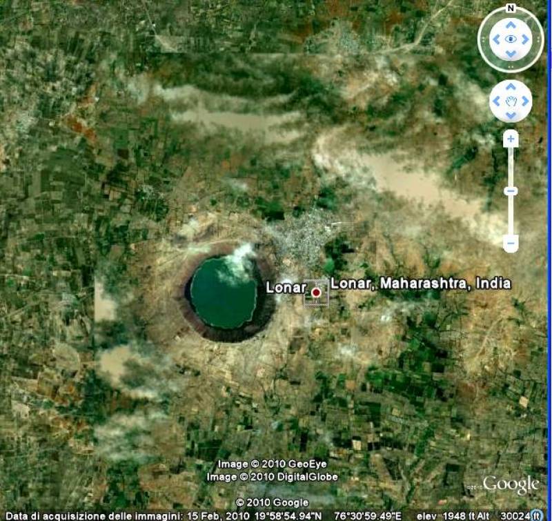 Occorre considerare un altro aspetto sorprendente. Circa 400 km a nord-est di Mumbai (Bombay) c'è un lago quasi circolare, che riempie un cratere del diametro di 2, 5 km e di 700 m di profondità, chiamato Cratere Lonar. È l'unica traccia conosciuta d'impatto in una formazione basaltica, con eiezione dei frammenti rocciosi sino a 1, 5 km di distanza, e contiene diverse colate di roccia fusa, spesse sino a 30 m. Il fondo del lago contiene noduli vetrificati di basalto, effetto di una pressione che deve aver superato le 600000 atmosfere.