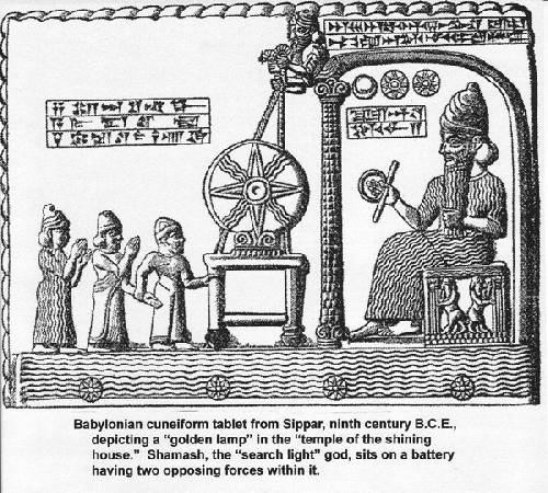 Altre iscrizioni sembrano riferirsi alla configurazione specifica di alcune divinità in certi luoghi. Si legge: "Sin, Shamash, Ishtar devono essere collocati uno di fronte all'altro, come un oceano che scorre corrente tra il serpente e la colonna." Se il peccato come il dio della luna rappresenta una polarità negativa e Ishtar, la dea Venere è una polarità positiva, Shamash e simboleggia l'unione dei due in una corrente alternata, quindi l'iniezione di energia elettrica "tra il serpente e la colonna" nel dispositivo di potere che circonda Shamash può essere quello che i poteri della "statua d'oro", così che divenne "un secondo sole. "Un altro dice il testo, " Ho fatto la tiara d'oro-disco di Shamash a brillare di nuovo e ha reso luminosa come il giorno ".