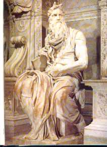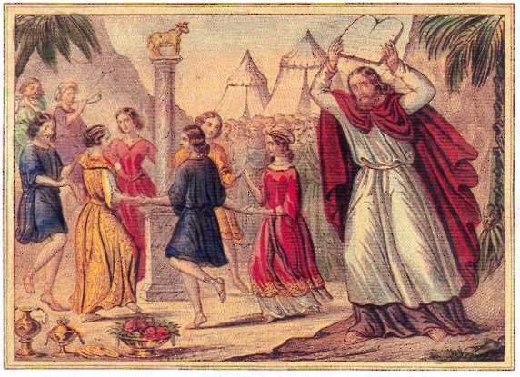 "...aveva nella mano le due tavole della testimonianza, tavole scritte su due lati, da una parte e dall´altra...Quando si avvicinò all´accampamento, vide il vitello e le danze: l´ira di Mosè si accese; egli scagliò dalla mano le tavole e le ruppe ai piedi del monte...."
