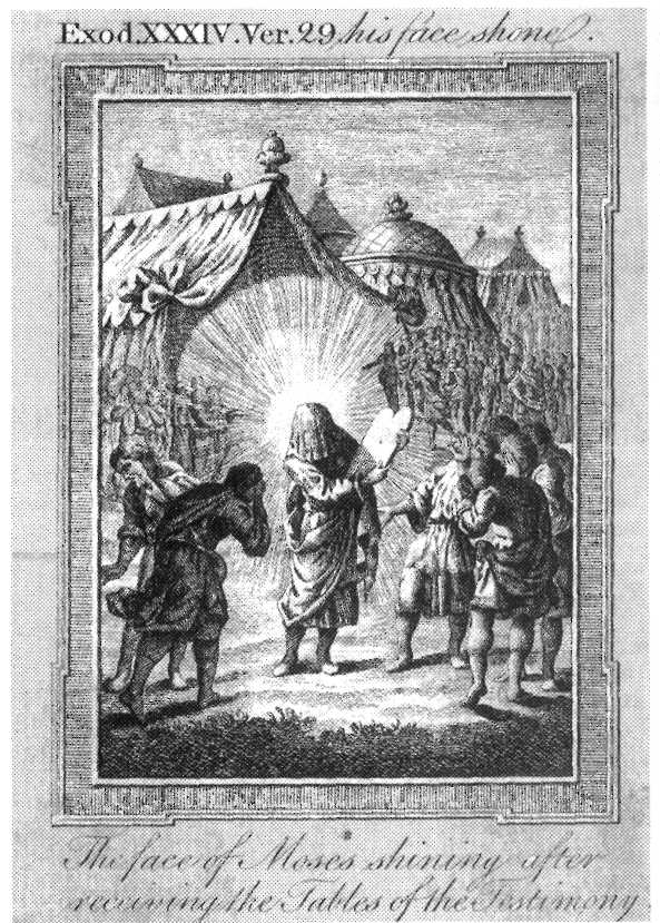 "Quando Mosè scese dal monte Sinai non sapeva che la pelle del suo viso era raggiante, per avere parlato con il Signore. Aronne e tutti i figli di Israele videro Mosè e d ecco la pelle del suo viso era raggiante; ebbero paura di avvicinarsi a lui. Mosè li chiamò e Aronne, con tutti i capi della comunità, andò da lui. Mosè parlò con loro...Quando Mosè ebbe finito di parlare con loro si mise un velo sul volto. Allorché Mosè entrava davanti al Signore per parlare con lui, toglieva il velo fin quando fosse uscito."...