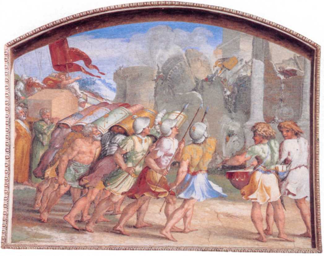 Dopo l´attraversamento delle acque del Giordano, le cui modalità di svolgimento ricordano molto dappresso l´attraversamento del Mar Rosso in uscita dall´Egitto, si svolse la battaglia di Gerico, i cui esiti sono entrati nell´immaginario collettivo per il modo singolare in cui maturarono. Mentre la popolazione rimaneva lontano, un gruppo di sacerdoti, (sette sacerdoti con sette trombe di corno), cominciarono a girare attorno alle mura della città, suonando, per sei giorni. Solo il settimo giorno fecero sette giri attorno alla città. Giosuè, 6 11-21: