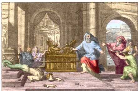 I Filistei la portarono dal luogo della battaglia, Ebenezer, ad Asdod, nel tempio del loro dio di nome Dagon ("grano"). Ma ecco il primo dei segni: la statua di Dagon fu ritrovata in frantumi sulla soglia del tempio.