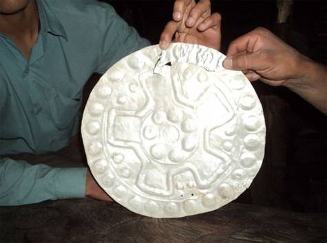 Il Biologo Leyda Gueiler ha detto che il manufatto in metallo (nella foto) sembra essere uno scudo di guerra, mentre gli ornamenti in pietra sono scolpiti a forma di foglie.