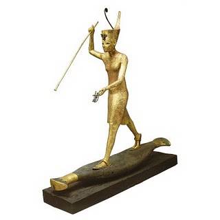 1. Una statua in legno placcato oro di Tutankhamon portato in spalla da una dea.