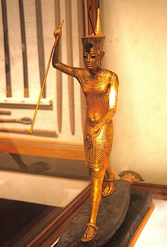 2. Una statua in legno placcato oro di Tutankhamon con l'arpione. Solo il torso e gli arti superiori mancano.